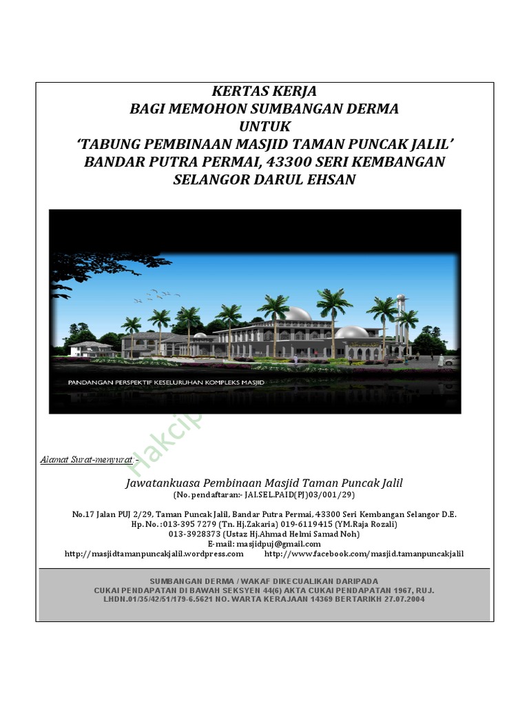 KERTAS KERJA BAGI MEMOHON SUMBANGAN DERMA UNTUK TABUNG PEMBINAAN MASJID TAMAN PUNCAK JALIL BANDAR PUTRA PERMAI 43300 SERI KEMBANGAN SELANGOR DARUL EHSAN Alamat Surat-menyurat-Jawatankuasa Pembinaan Masjid Taman Puncak Jalil No. Objektif Objektif kertas cadangan ini adalah untuk memohon kebenaran untuk mendirikan sebuah masjid di sebuah kawasan seluas 403 ekar di kawasan Bandar Permata Lunas yang telah digazetkan untuk pembinaan sebuah masjid. Muat turun halaman 1-13 di AnyFlip.